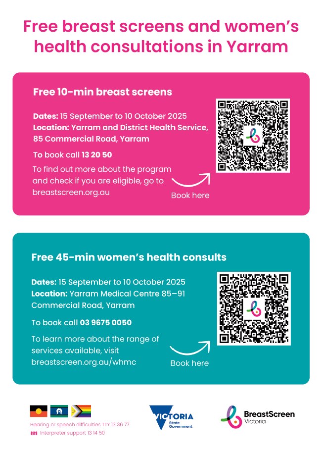 Wednesday 10 September 2025 yarramcommunitylearningcentre Breast Screen Bus The Breast Screen Bus is coming to Yarram, along with a women’s mobile health clinic. Book in now! Share this:Share Click to share on X (Opens in new window) X Click to share on Facebook (Opens in new window) Facebook Like Loading...