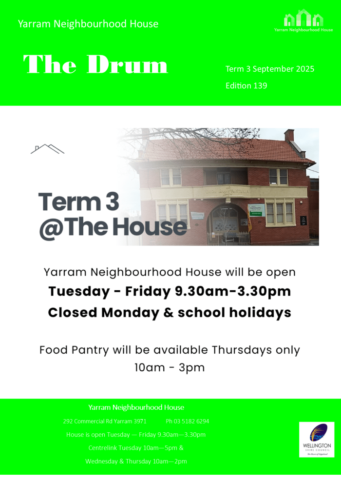 Wednesday 10 September 2025 yarramcommunitylearningcentre The Drum September 2025 The September Edition of The Drum is now out and full of exciting things that are happening at The House. The Drum No 139 September 2025 Share this:Share Click to share on X (Opens in new window) X Click to share on Facebook (Opens in new window) Facebook Like Loading...