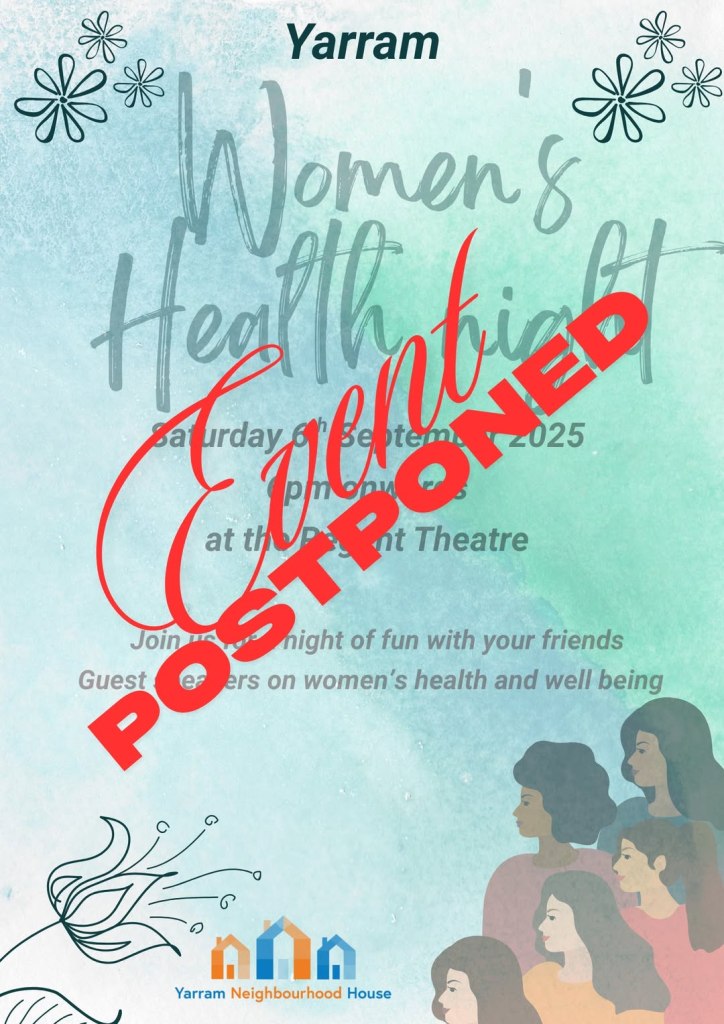 Wednesday 10 September 2025 yarramcommunitylearningcentre Women’s Health Night Postponed Sadly we have to postpone this event. New Date TBA Share this:Share Click to share on X (Opens in new window) X Click to share on Facebook (Opens in new window) Facebook Like Loading...