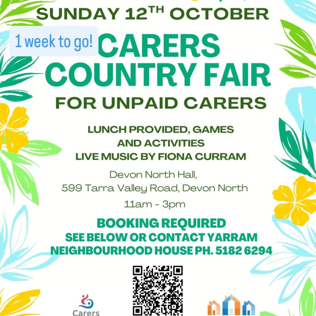 Thursday 9 October 2025 yarramcommunitylearningcentre Carers Country Fair Unpaid Carers – bring your family for lunch and an enjoyable afternoon at Devon North hall. Booking appreciated for catering purposes via the QR code or message Yarram Neighbourhood House on Facebook. Share this:Share Click to share on X (Opens in new window) X Click to share on Facebook (Opens in new window) Facebook Like Loading...